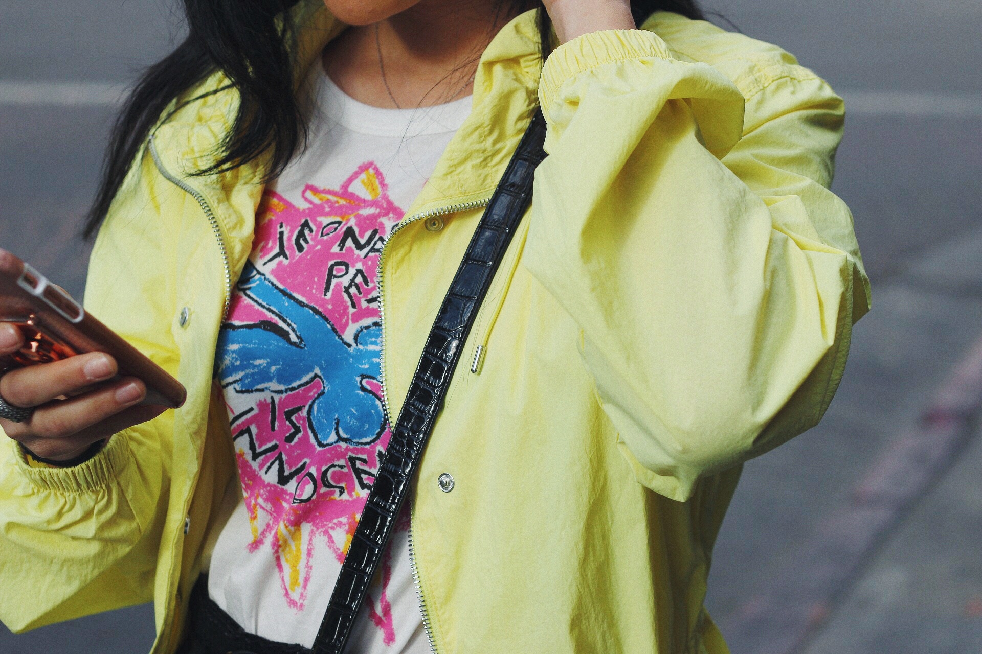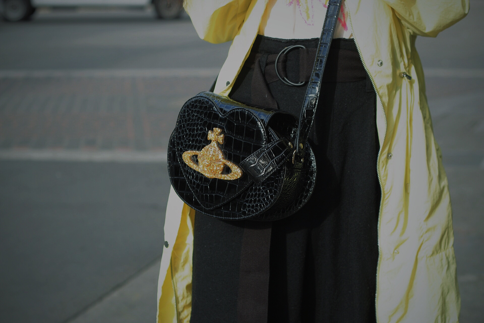 To keep my outfit balanced from the bright colors, I chose black pants and a black bag. The pants are from Opening Ceremony and the bag is from Vivienne Westwood. The pants fit wide leg so it went with the flow of the jacket and the tight tee. Vivienne’s logo – the Orb on my bag matched with the yellow coat so using it with this outfit was a must!