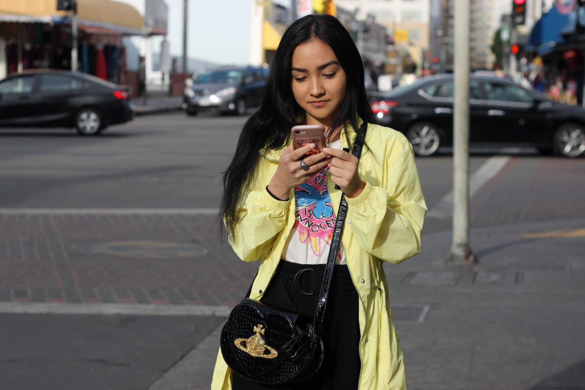 If your wearing a bright colored outerwear, the inner wear should be subtle but have a few colors that match with the jacket. Which is why I chose a graphic tee! This one is from Vivienne Westwood, it is from her World’s End Collection. If you look closely the bird is a penis, which I honestly love because it is SO Vivienne! She is one my favorite designers and her creativity is off the charts. This tee worked out perfectly with the jacket because of the colors. The graphic is a sun so it also fit the energy I was trying to give off because of the gloomy day in LA.