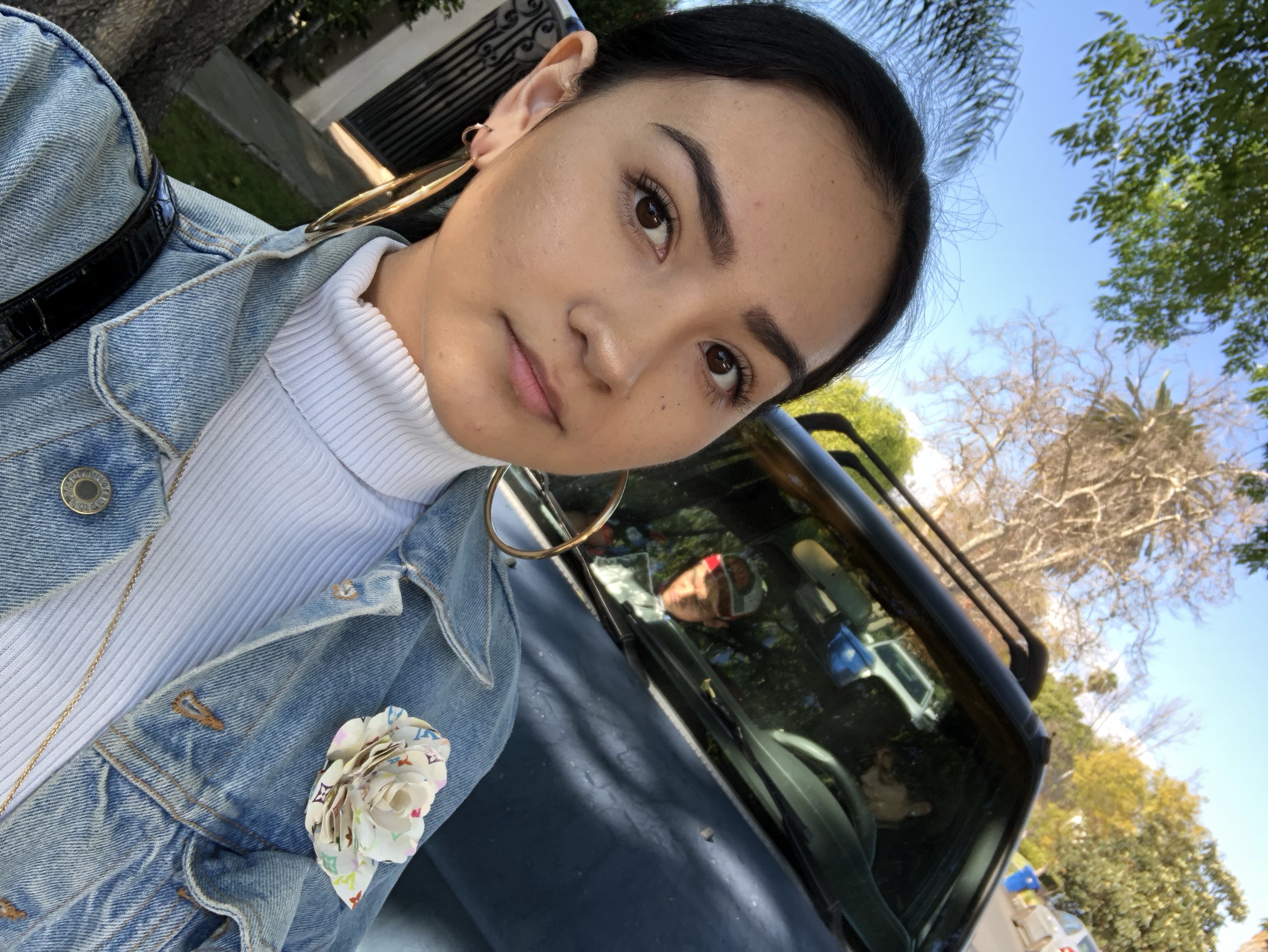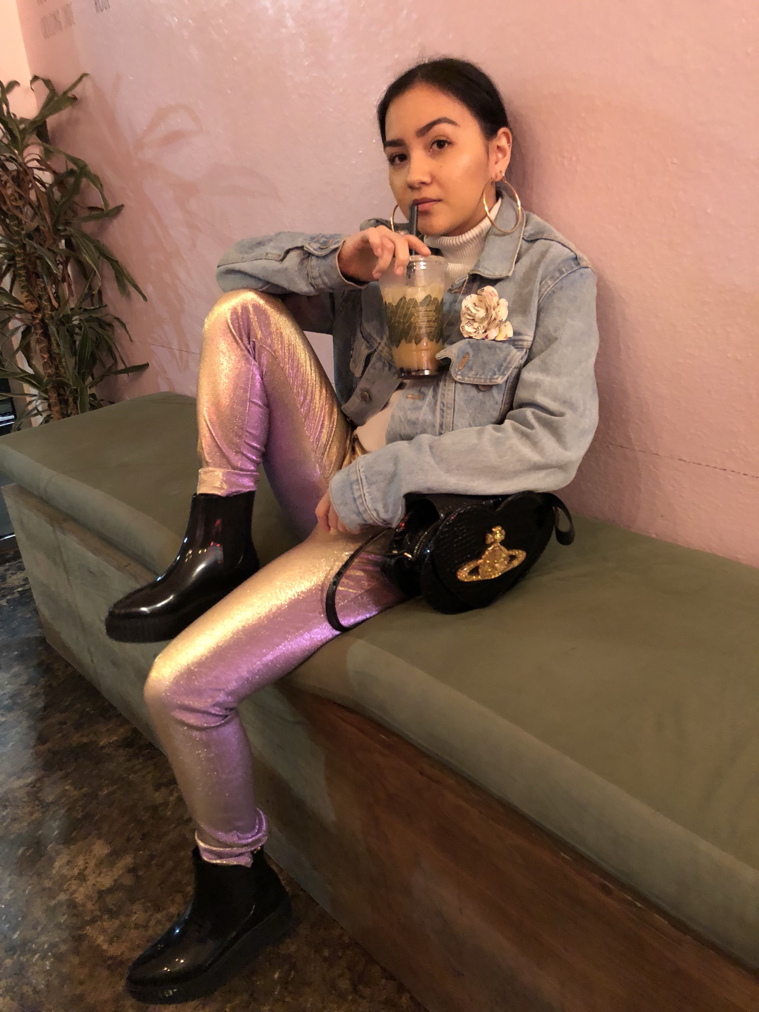 Today I planned my outfit around these awesome Vivienne Westwood purple metallic jeans. They are so stretchy and the comfiest jeans I ever owned! In the sunlight theres streaks of gold so my accessories were all gold plated. I put on some gold hoop earrings and a Vivienne Westwood gold chain necklace. I wanted to tone down the colors so I put on a simple white turtle neck topI thrifted at Goodwill. For my outer wear I wore a light washed Denim Jacket from Brandy Melville and accessorized it with a Louis Vuitton multi color brooch to go with the jeans. For my shoes I wore my favorite pair of boots from Vivienne Westwood – my go-to shoes!