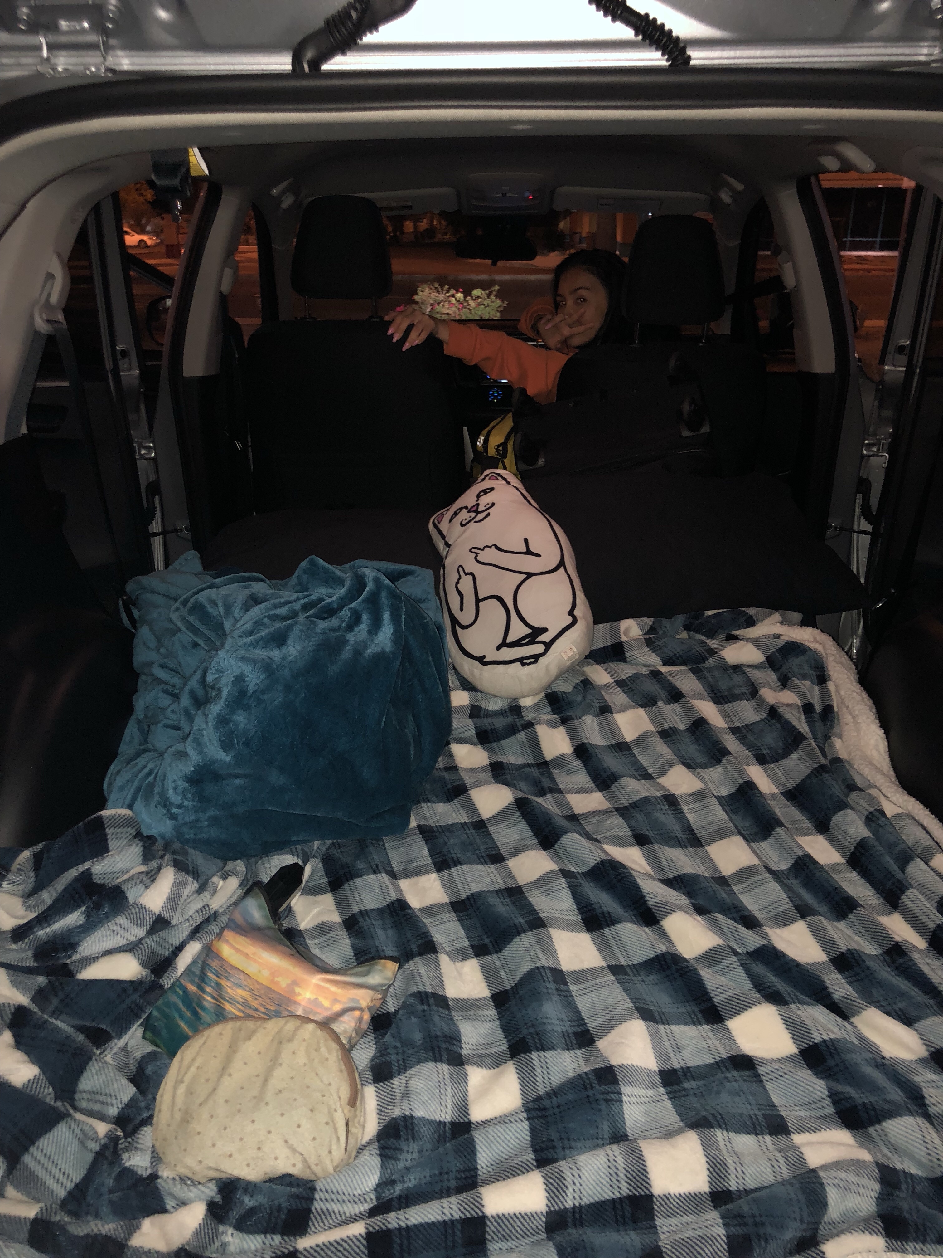Our bed in our rental car