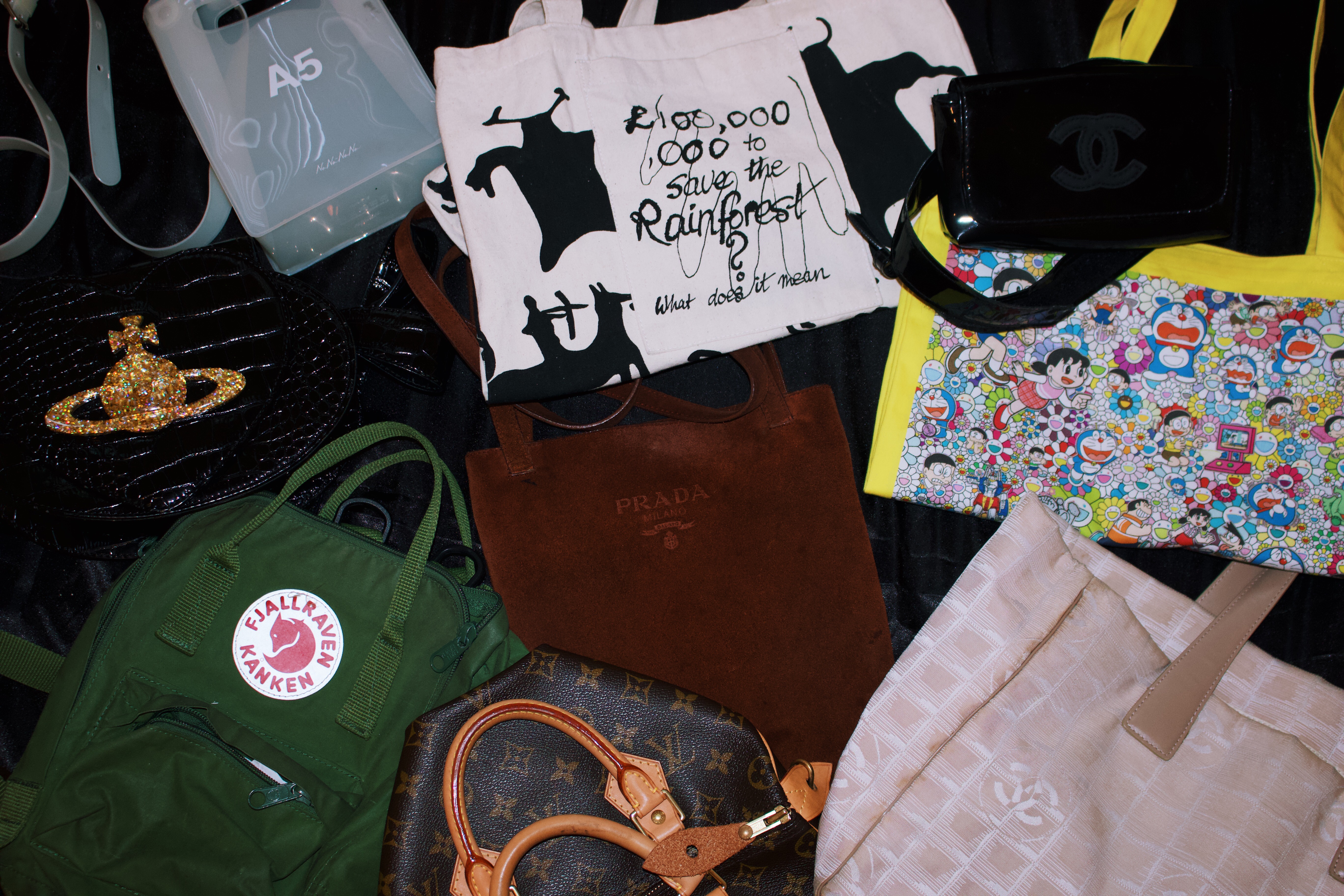 Now the first step is choosing which bag to use. Big bag, small bag, tote bag, shoulder bag, cross-body, fanny pack.. the list can go on. Since I am usually working 5 days out of the week and I carry a lot of stuff – I like to carry a big bag. I like bags that have an easy access to grab anything at anytime without a struggle. In this case my Chanel bag, Murakami & Vivienne totes bags, are my go-to. For the days I am running errands and I don’t need to carry lots of stuff I go with my Prada or Nananana cross-body bag. I love cross-body bags because I can use my hands without holding on to anything and just go on with my day. I probably sound super lazy right now but I love things that are convenient to my daily routines! Not lazy – just practical. Lastly, every girl has a bag that only make an appearance at night or special occasions. Those bags are special, expensive, and a statement piece. My Louis Vuitton and Vivienne Westwood bags fall into that category.