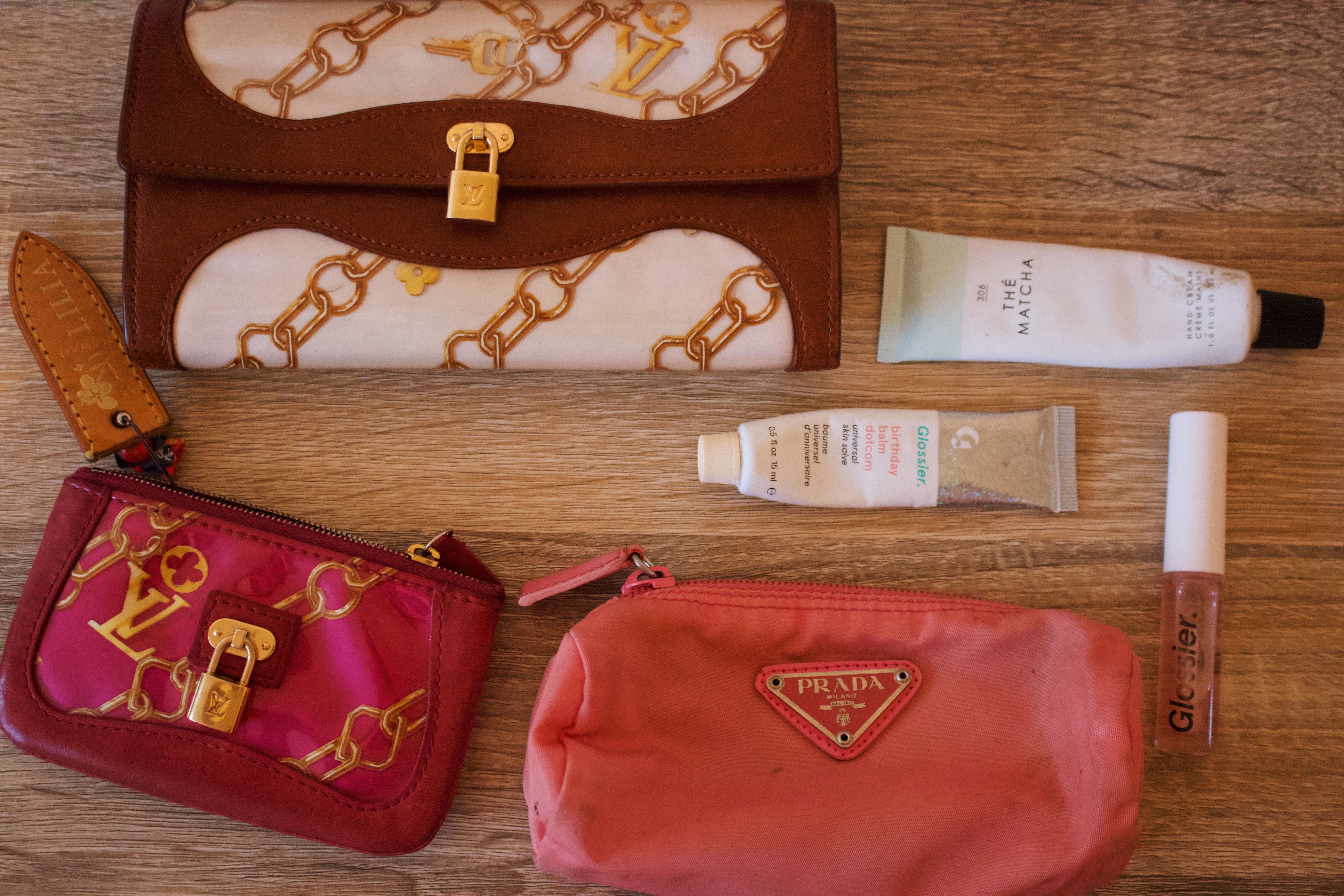 During my trip back home to Hawai’i my mother gifted me her old Louis Vuitton. She gave me a matching Louis Vuitton wallet and key holder from the limited edition SS06 charms collection! I personally love big wallets because it’s easier to find in my bag. Having my keys all in one place helps me find it faster when I have lots of things in my big bag. Plus it’s so cute and I love it! My mini Prada pouch is also a gift from my mother – a long time ago. I used to use it for all of my Nintendo DS games when I was younger, and I recently found it and I was like “OMG Prada!” Haha, my mom didn’t really care for Prada which explains why she gave it to me at a very young age. Well, I like Prada so i’m very happy I get to use it for my hand cream, Glossier lip gloss, and lip balm. If you’re reading this mom – thank you!