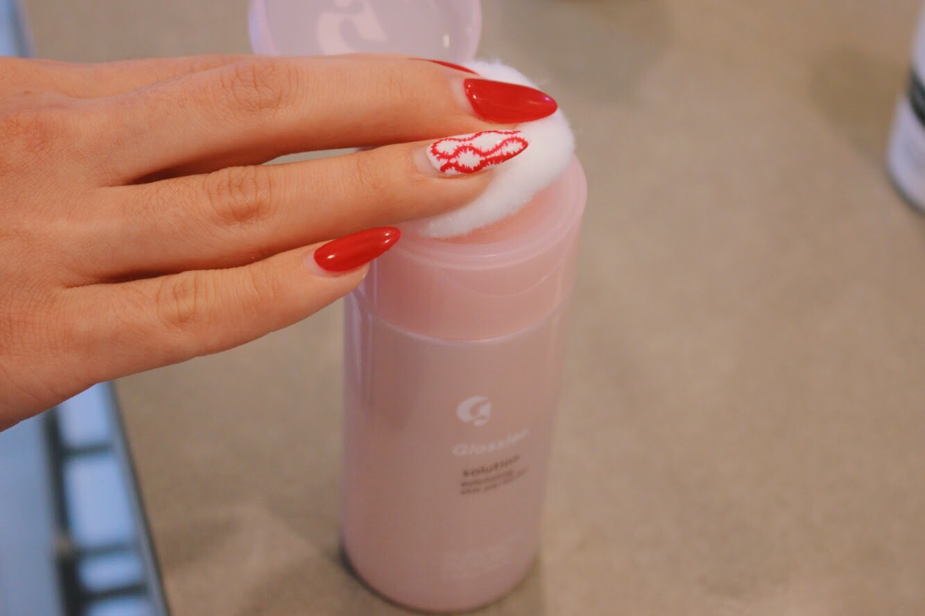 After cleansing and drying my face, I grab a cotton ball and pump it 2-3 times in the Solution. I love the way Glossier designed this bottle because the pump actually doesn’t use too much of the solution and is the perfect amount for sensitive skin. If you have very sensitive skin – I say start off with 1-2 pumps. I have sensitive skin as well but I love how clean it makes my skin feel!