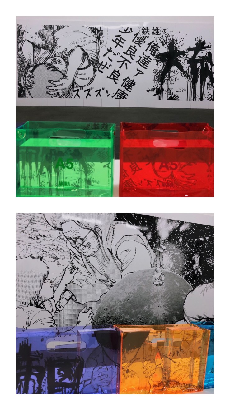 There are 6 different colors. Each bag has different art from the film, and if you line up all bags in order it connects as Otomo’s mural for “Akira” which is also presented at the exhibition. It is a gigantic mural and super exciting to see in person. My favorite is definitely red and yellow from the bags – it has the best graphics.