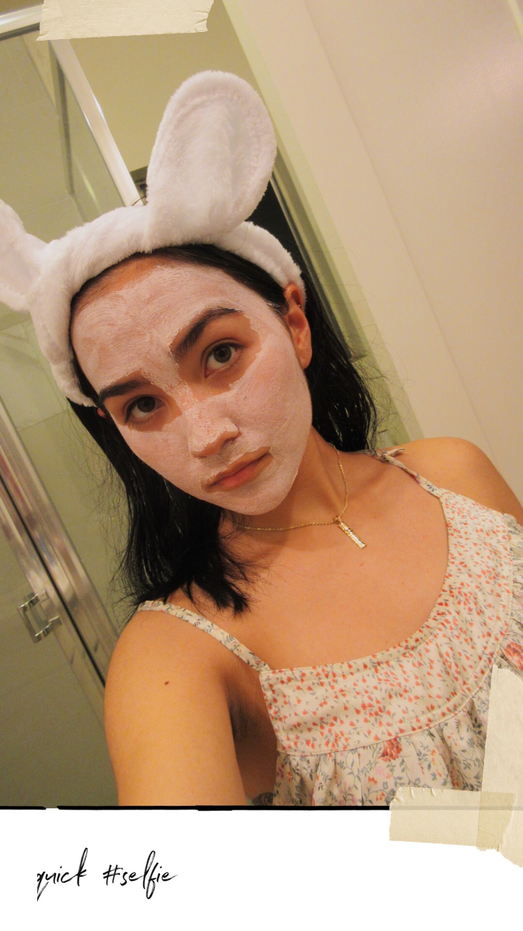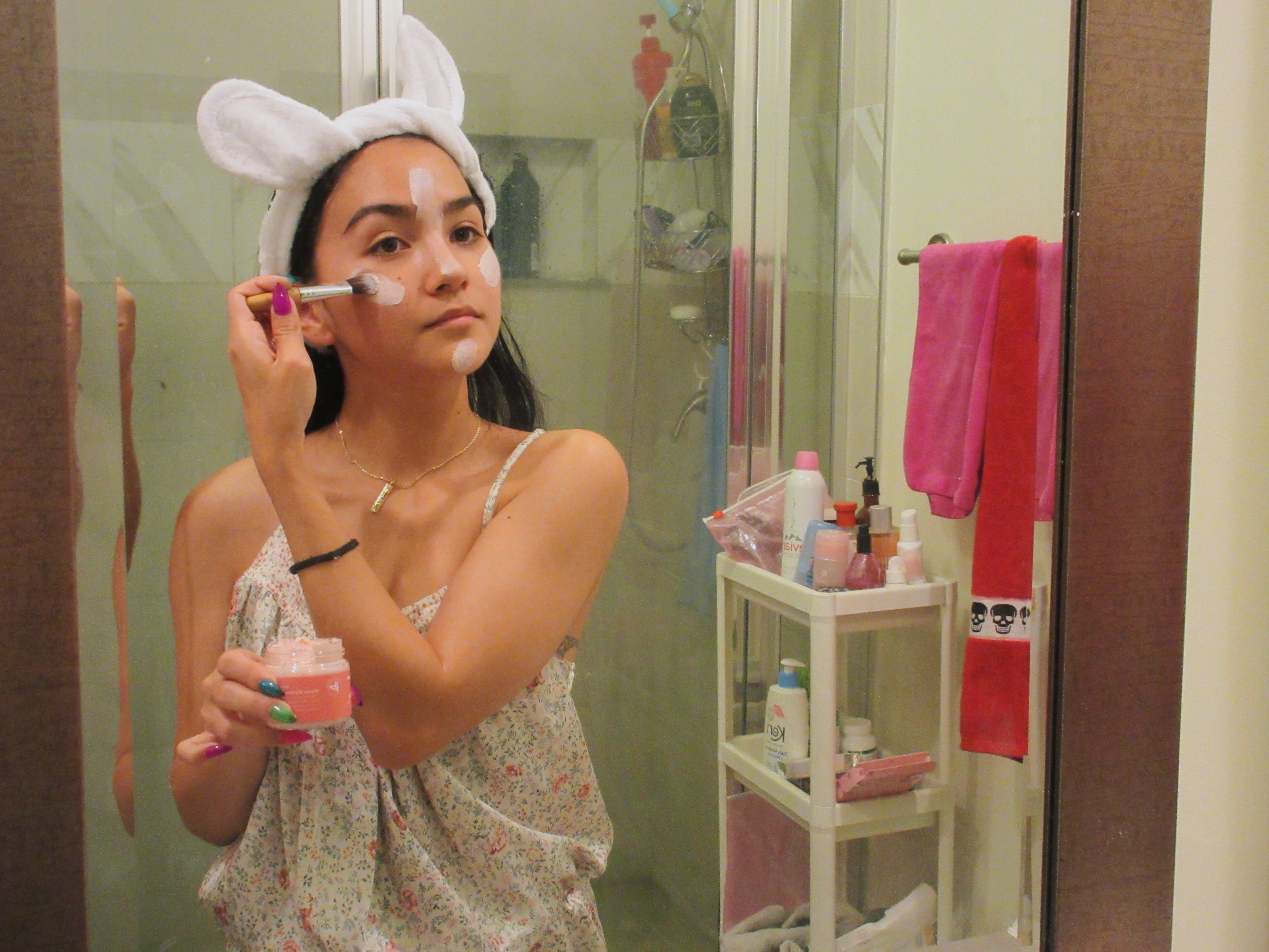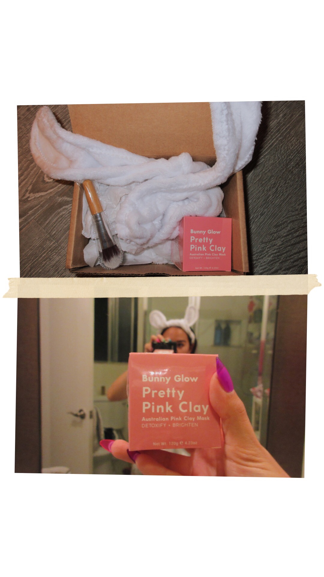 I received a skincare bundle which includes an applicator frosted tip brush, bunny ear headband, and of course the pretty pink clay mask. Super cute bundle! I never used a brush to apply a face mask before so that was exciting. The headband is adorable for selfies and helps push all your hair back so it won’t stick onto your face with the mask on (happens to me a lot)!