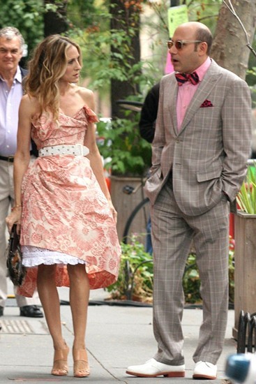 Carrie wearing the iconic/classic assymetrical corseted rose dress from the spring/summer 2007 collection was a great moment for the Westwood fans. She paired it with her favorite shoe brand in the show; Manolo Blahnik. Her feather clutch is Salvatore Ferragamo.