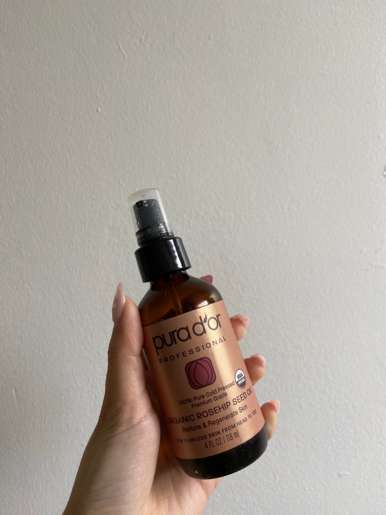 I use Pura D’or Organic Rose Hip Oil 100% which is cold pressed. Like I said above, all you need is one or two pumps (depending how dry your skin is). You can find it easily on amazon, or click here.