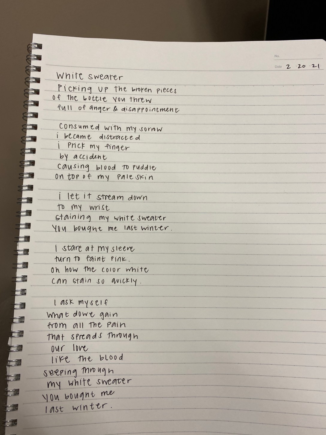 Hi Bloomers, I have been attempting to write something everyday. Writing my feelings, poems, working on my memoir.. at least a few sentences everyday. If you don’t stay consistent, you’ll start to feel like your hobby is a chore. I learned that the hard way, so i’m giving myself creative freedom. Here is a poem… Continue reading White Sweater